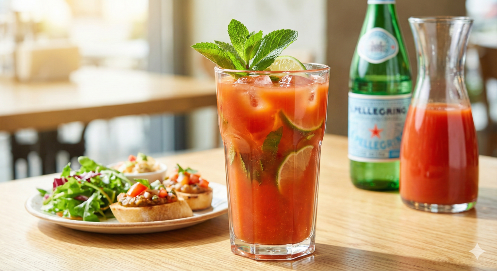 - トマトジュースのノンアルコールカクテル トマトジュースに炭酸水やトニックウォーターを加え、ミントの葉やライムを添えると、見た目も華やかなドリンクになります。食事と一緒に楽しむことで、食後の血糖値スパイク抑制にも役立ちます。