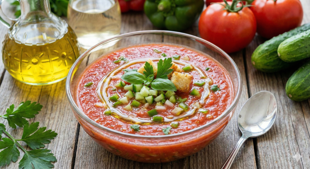 - 冷製トマトスープ(ガスパチョ風) トマトジュースをベースに、きゅうり、ピーマン、玉ねぎなどの野菜を細かく刻んで加えます。オリーブオイルと少量の酢で味を調えれば、夏場にぴったりのさっぱりとした冷製スープに。野菜の食物繊維も一緒に摂れるため、血糖値の上昇を緩やかにする効果も期待できます。
