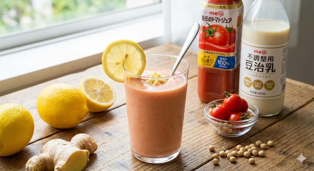 - トマトジュースと豆乳のヘルシースムージー 無塩トマトジュース150mlと無調整豆乳100mlを混ぜるだけで完成。お好みで少量のレモン汁や生姜のすりおろしを加えると、風味が増し、さらに飲みやすくなります。朝食の置き換えや、小腹が空いた時におすすめです。